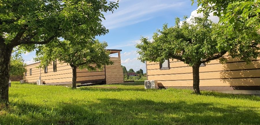 Na voljo so 4 udobne mobilne hiške z leseno teraso. Od leve proti desni, Deluxe 2-sobna hiška LEPOCVETKA z ločenima spalnicama, 1.5-sobni MOŠANCELJ s kraljičino posteljo, 1-sobni studio JONATAN s kraljičino posteljo in 1.5-sobni CARJEVIČ z dvema ločenima posteljama.